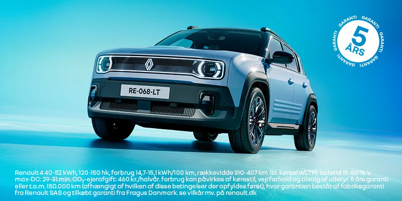 Renault 4 40-52 kWh, 120-150 hk, forbrug 14,7-15,1 kWh/100 km, rækkevidde 310-407 km (bl. kørsel WLTP). ladetid 15-80 % v. max-DC: 29-31 min. CO₂-ejerafgift: 460 kr./halvår. forbrug kan påvirkes af kørestil, vejforhold og tilvalg af udstyr. 5 års garanti eller t.o.m. 150.000 km (afhængigt af hvilken af disse betingelser der opfyldes først), hvor garantien består af fabriksgaranti fra Renault SAS og tilkøbt garanti fra Fragus Danmark. se vilkår mv. på renault.dk