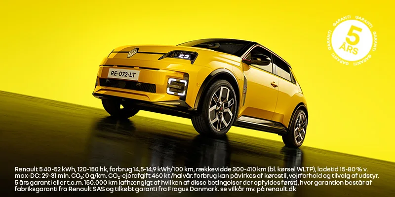 Renault 5 40-52 kWh, 120-150 hk, forbrug 14,5-14,9 kWh/100 km, rækkevidde 300-410 km (bl. kørsel WLTP). ladetid 15-80 % v. max-DC: 29-31 min. CO₂: 0 g/km. CO₂-ejerafgift 460 kr./halvår. forbrug kan påvirkes af kørestil, vejforhold og tilvalg af udstyr. 5 års garanti eller t.o.m. 150.000 km (afhængigt af hvilken af disse betingelser der opfyldes først), hvor garantien består af fabriksgaranti fra Renault SAS og tilkøbt garanti fra Fragus Danmark. se vilkår mv. på renault.dk