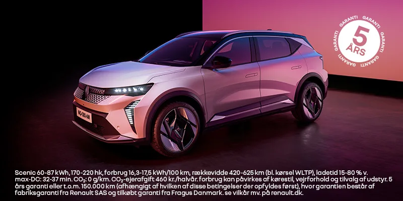 Scenic 60-87 kWh, 170-220 hk, forbrug 16,3-17,5 kWh/100 km, rækkevidde 420-625 km (bl. kørsel WLTP), ladetid 15-80 % v. max-DC: 32-37 min. CO₂: 0 g/km. CO₂-ejerafgift 460 kr./halvår. forbrug kan påvirkes af kørestil, vejforhold og tilvalg af udstyr. 5 års garanti eller t.o.m. 150.000 km (afhængigt af hvilken af disse betingelser der opfyldes først), hvor garantien består af fabriksgaranti fra Renault SAS og tilkøbt garanti fra Fragus Danmark. se vilkår mv. på renault.dk.